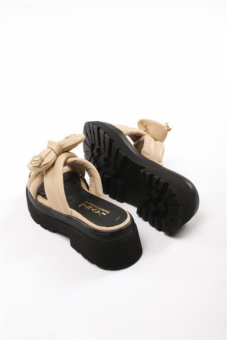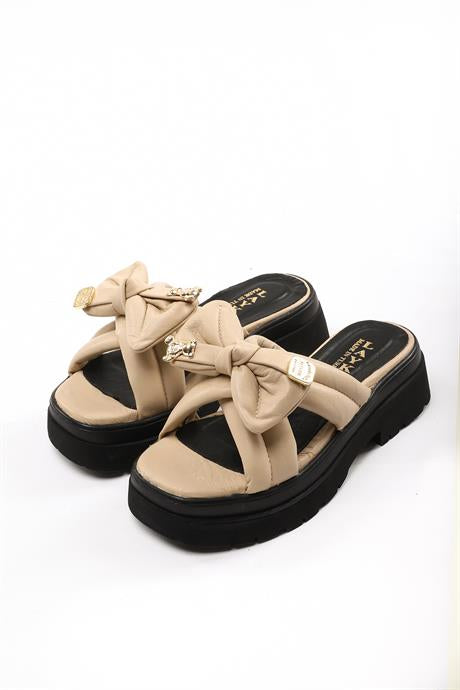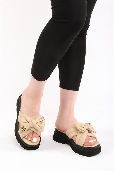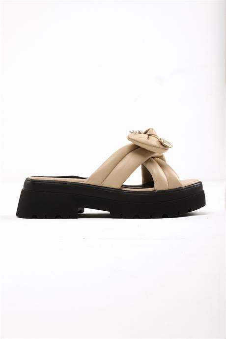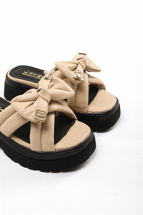 Cesa Bej Renkli Mat Deri Kurdela Detaylı Taşlı Kadın Terlik