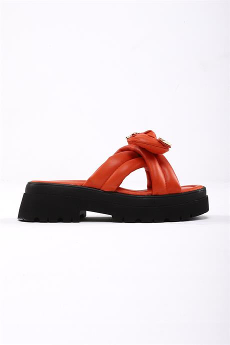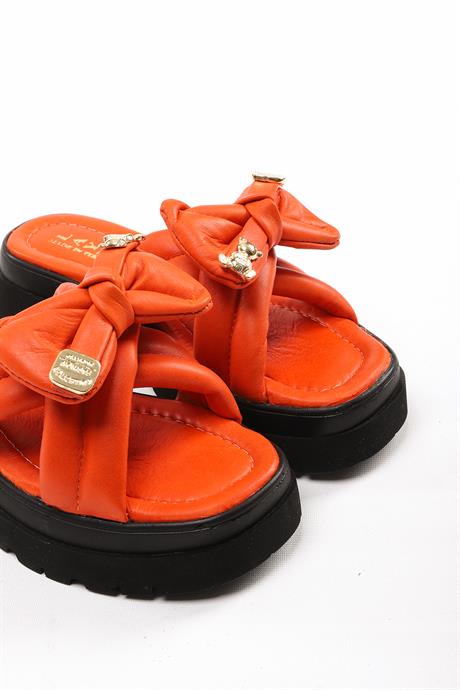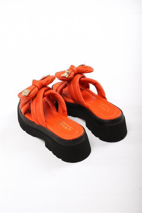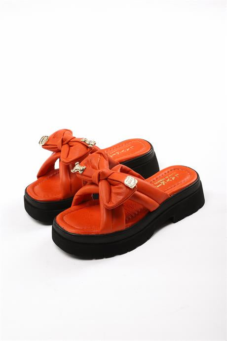Cesa Turuncu Renkli Kurdela Detaylı Taşlı Mat Deri Kadın Terlik