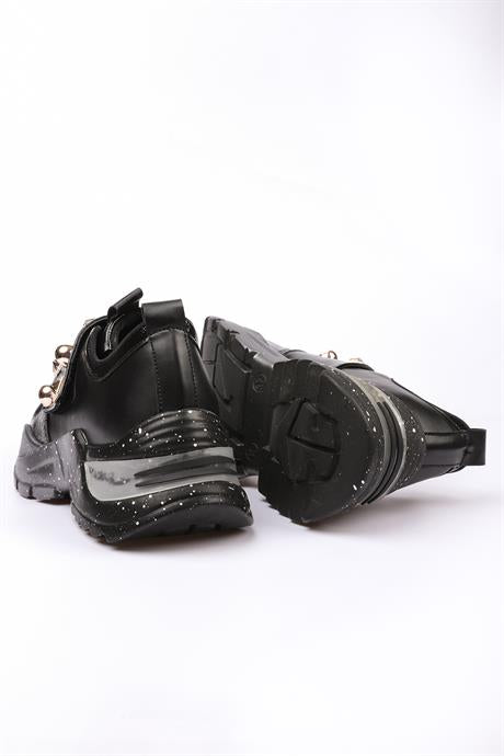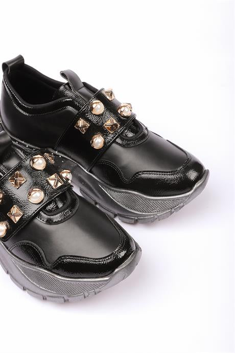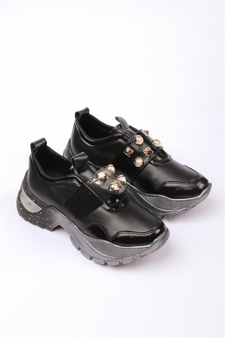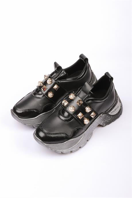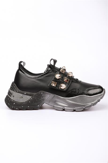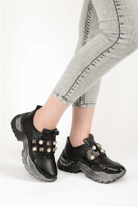 Corkas Siyah Renkli Taşlı Platin Renkli Tabanlı Kadın Spor Yürüyüş Ayakkabısı