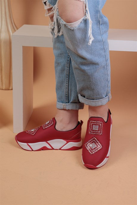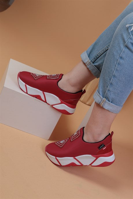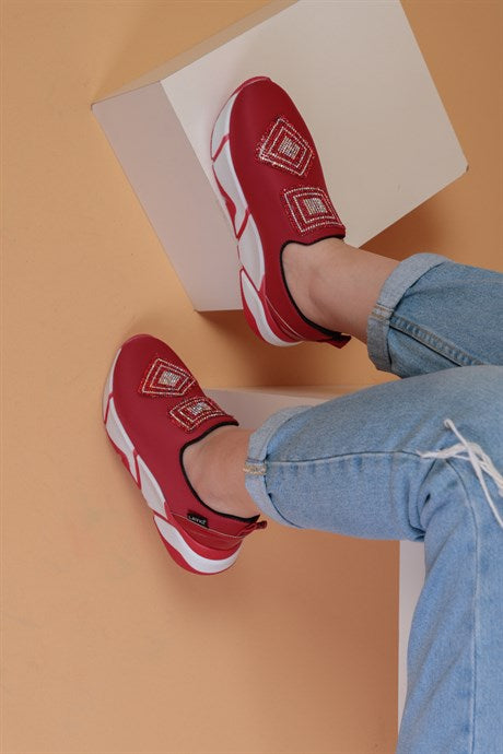 İmmobile Kırmızı Renkli Önü Parlak Taşlı Paraşüt Kumaş Lux Kadın Spor Ayakkabı